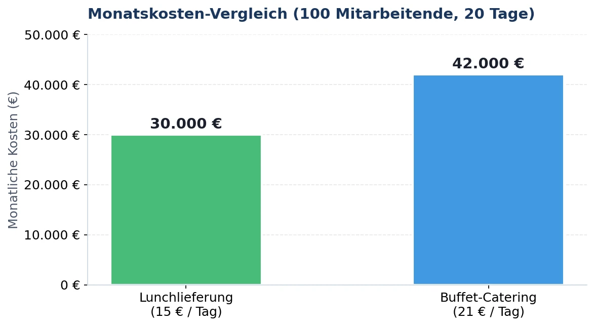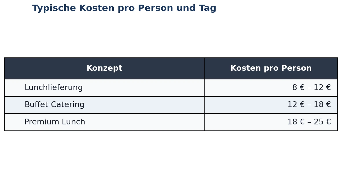 Je nach Konzept zwischen 8 und 25 Euro pro Person und Tag. Eine einfache Lunchlieferung liegt bei 10 bis 15 Euro, ein Premium-Angebot mit Buffet und Service bei 18 bis 25 Euro.