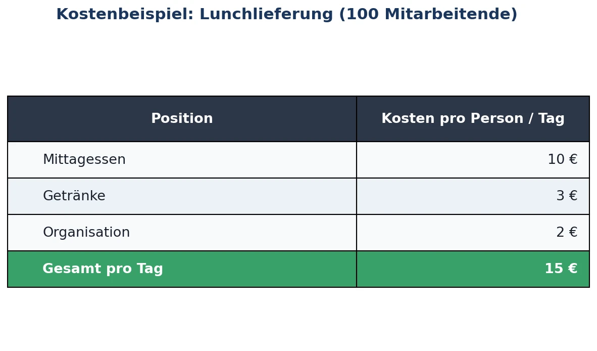 Um die Kosten greifbar zu machen, zeigen zwei Praxisbeispiele, mit welchem Budget Unternehmen bei 100 Mitarbeitenden und 20 Arbeitstagen pro Monat rechnen können.