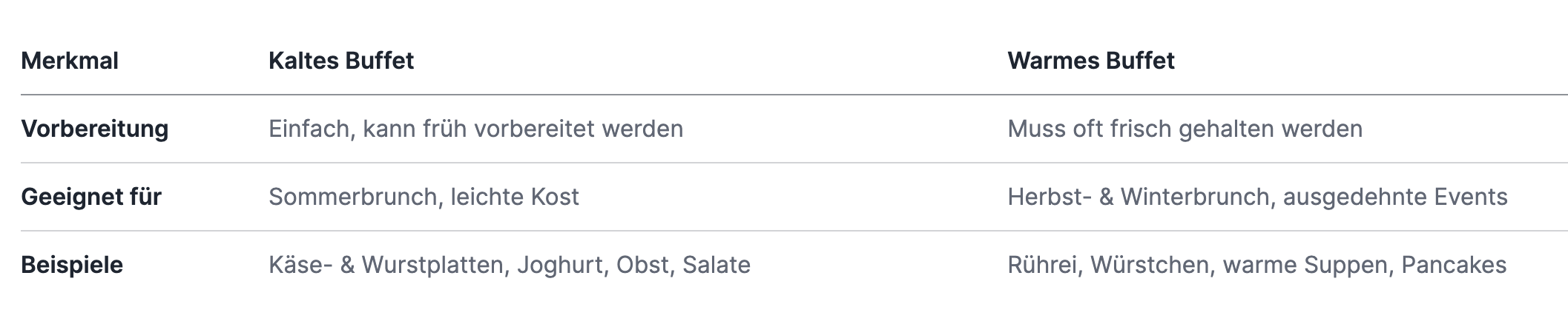 📌 Tipp: Wer sich inspirieren lassen möchte, kann sich Beispiel-Menüs anschauen: Brunch Buffet Menü-Ideen