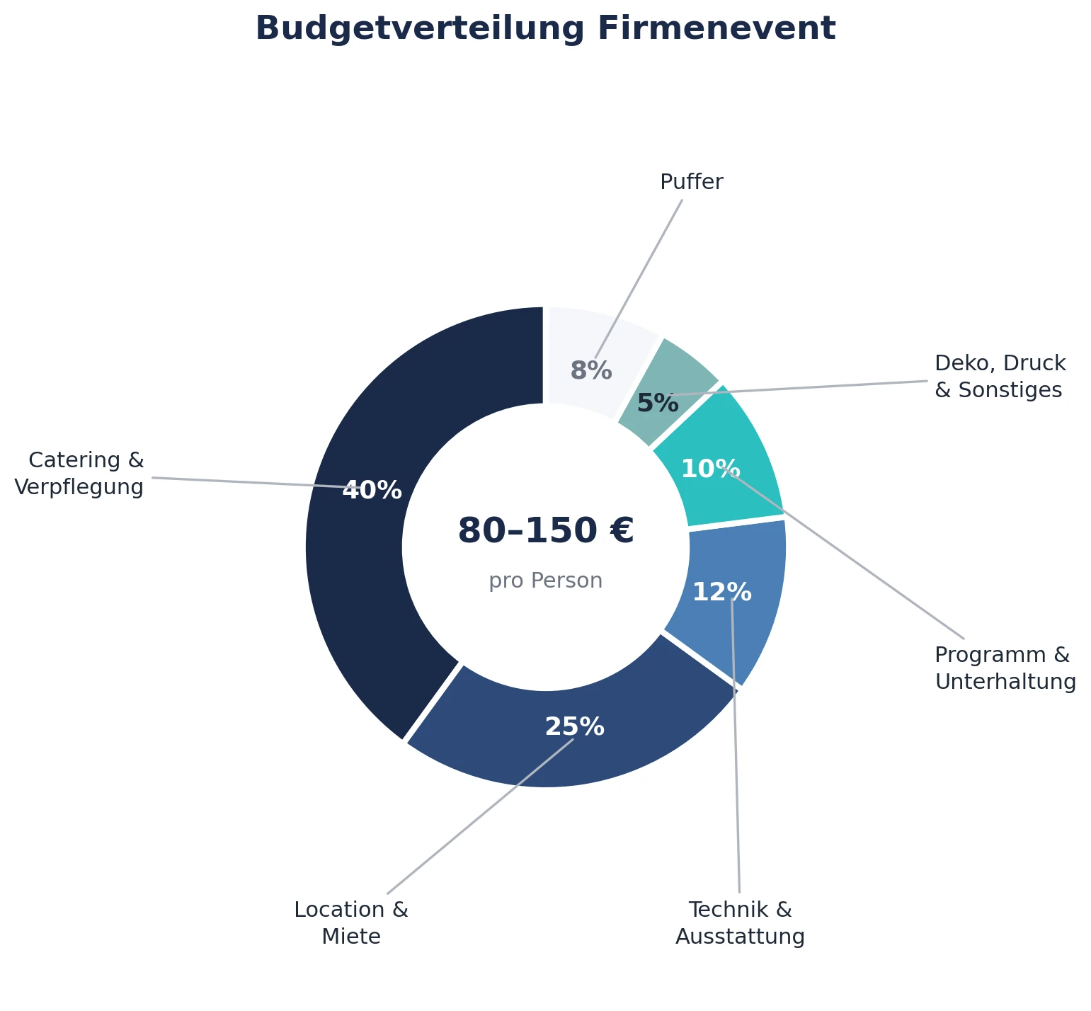 Die Budgetplanung ist der neuralgische Punkt jeder Eventplanung. Zu knapp kalkuliert, leidet die Qualität. Zu großzügig, fehlt die Effizienz. Die folgende Verteilung hat sich bei hunderten Firmenveranstaltungen als Orientierung bewährt.