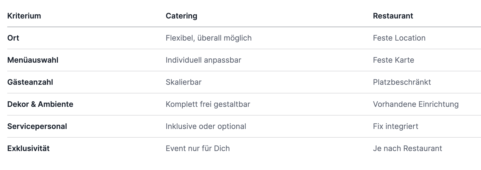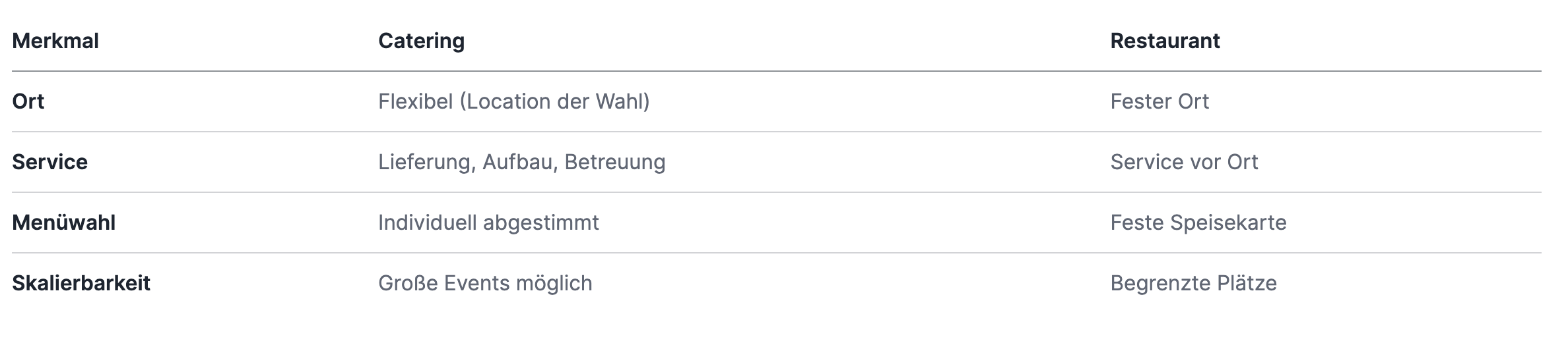 📌 Fazit: Wer ein individuelles Erlebnis plant, ist mit Catering meist flexibler & persönlicher unterwegs – insbesondere bei Hochzeiten, Firmenfeiern oder Gartenpartys.