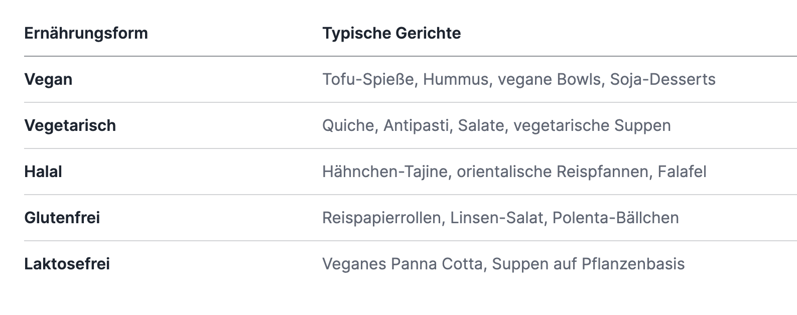 📌 Tipp: Wer rein pflanzlich oder auf spezielle Bedürfnisse ausgerichtet plant, findet professionelle Lösungen im Bereich veganes Catering.