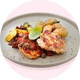 Hähnchenbrust mit Caponata, serviert mit Zucchini-Tomaten-Gemüse und Rosmarin-Backkartoffeln