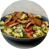 Avocado-Falafel-Salat mit Tomaten, Gurken, Olivenöl, Essig, Granatapfelmelasse und Brot